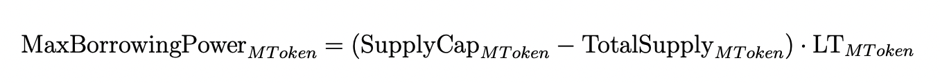 The value of assets that can be borrowed against MToken as collateral is also limited by Supply Cap_(MToken) and LT_(MToken), which we denote with MaxBorrowingPower_(MToken):